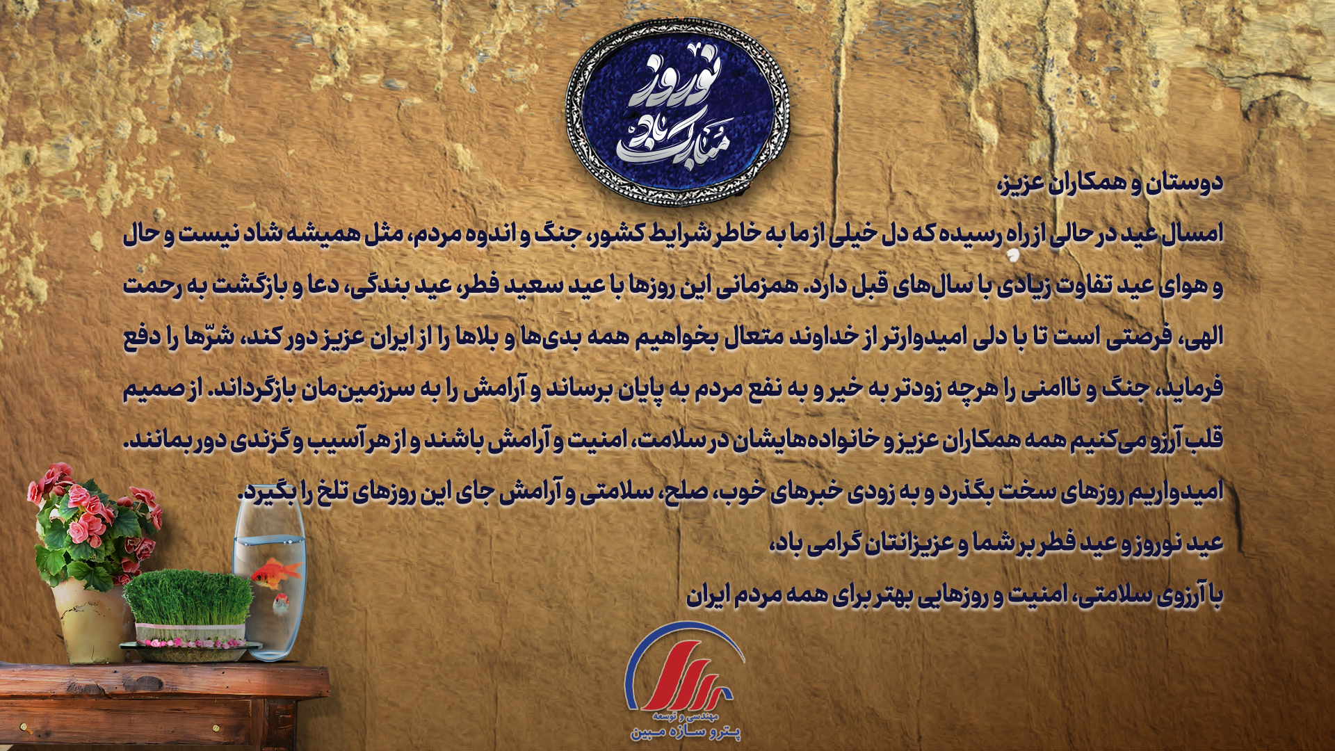 دوستان و همکاران عزیز،امسال عید در حالی از راه رسیده که دل خیلی از ما به خاطر شرایط کشور، جنگ و اندوه مردم، مثل همیشه شاد نیست و حال و هوای عید تفاوت زیادی با سالهای قبل دارد. همزمانی این روزها با عید سعید فطر، عید بندگی، دعا و بازگشت به رحمت الهی، فرصتی است تا با دلی امیدوارتر از خداوند متعال بخواهیم همه بدیها و بلاها را از ایران عزیز دور کند، شرّها را دفع فرماید، جنگ و ناامنی را هرچه زودتر به خیر و به نفع مردم به پایان برساند و آرامش را به سرزمینمان بازگرداند.